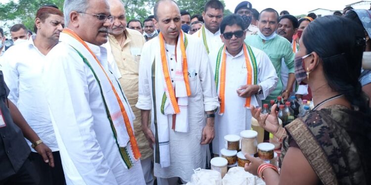 गांधी जी के सपनों के अनुरूप छत्तीसगढ़ की ग्रामीण अर्थव्यवस्था को मजबूती देने के लिए चलाई जा रही सुराजी गांव योजना के गरूवा घटक के अंतर्गत पारागांव में बनाए गए गौठान का मुख्यमंत्री भूपेश बघेल ने आज सचिन राव के साथ निरीक्षण किया। उन्होंने स्व-सहायता समूहों द्वारा गौठानों में स्थापित किए गए रूरल इंडस्ट्रियल पार्क में की जा रही आर्थिक गतिविधियों का जायजा लिया।