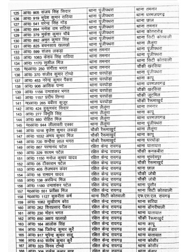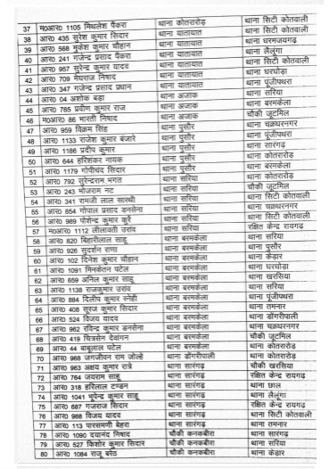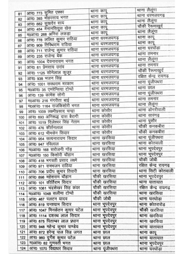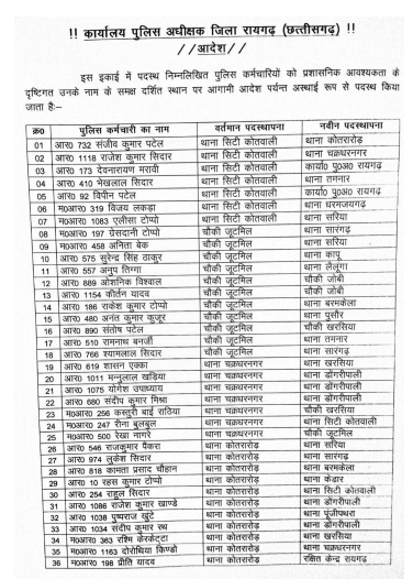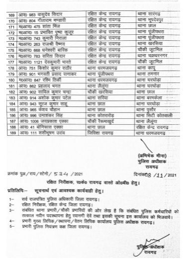रायगढ़। मुख्यमंत्री भूपेश बघेल के निर्देश के बाद छत्तीसगढ़ पुलिस विभाग में लगातार तबादले का सिलसिला जारी है। रायगढ़ जिले में बड़ी संख्या में पुलिसकर्मियों को इधर से उधर किया गया है। एसपी अभिषेक मीणा ने आदेश जारी करते हुए 189 आरक्षक और महिला आरक्षक का तबादला किया है।