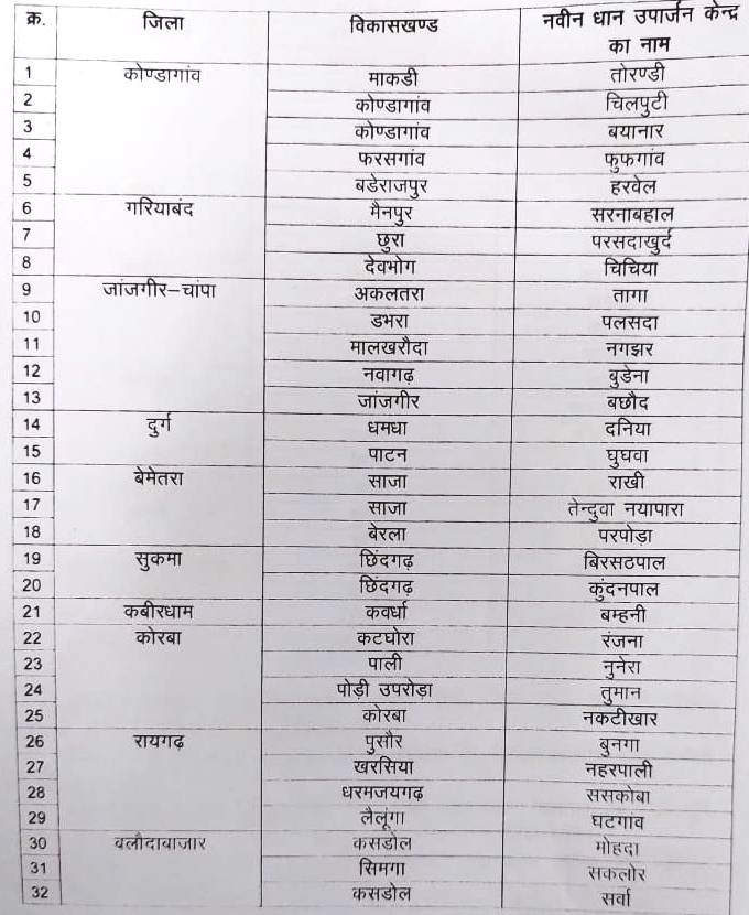 रायपुर। राज्य शासन द्वारा ग्रामीणों-कृषकों की सुविधा को ध्यान में रखते हुए खरीफ विपणन वर्ष 2021-22 और आगामी खरीफ विपणन वर्षों के लिए प्रदेश के विभिन्न जिलों 67 नवीन धान खरीदी केन्द्र खोलने की अनुमति प्रदान की गई है। मंत्रालय महानदी भवन स्थित खाद्य, नागरिक आपूर्ति एवं उपभोक्ता संरक्षण विभाग द्वारा इस आशय का आदेश जारी कर दिया गया है।