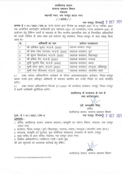 रायपुर। छत्तीसगढ़ सरकार ने आदिवासी नृत्य महोत्सव और राज्योत्वस के आयोजन के लिए 2020 बैच के 7 आईएएस अधिकारियों को रायपुर कलेक्टर के साथ अटैच किया है। ये सभी सहायक कलेक्टर हैं। इस आयोजन तक वे रायपुर कलेक्टर के साथ अटैच होकर उनके निर्देशों के अनुसार काम करेंगे।