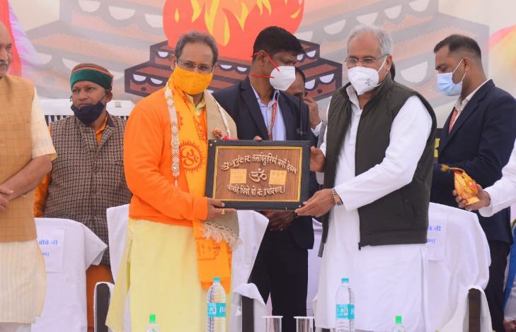 रायपुर। मुख्यमंत्री भूपेश बघेल ने सोमवार को बेमेतरा जिले के बेरला विकासखंड के ग्राम सिलघट (भिंभौरी) में गायत्री परिवार द्वारा आयोजित जिला स्तरीय गर्भ संस्कार महोत्सव के कार्यक्रम में शामिल हुए। अखिल विश्व गायत्री परिवार शांतिकुंज हरिद्वार के तत्वाधान में आयोजित कार्यक्रम में लगभग 525 गर्भवती महिलाओं का पुंसवन संस्कार किया गया। इस शुभ अवसर पर उन्होंने जिले के भिंभौरी ग्राम पंचायत को नगर पंचायत बनाने तथा ग्राम सिलघट में उप स्वास्थ्य केंद्र खोलने की घोषणा की। इसके अलावा सिलघट ग्राम के आस पास बरसाती नाला में स्टॉप डैम की घोषणा उन्होंने की। ग्राम में श्रीराम स्मृति वन स्थापना हेतु भूमिपूजन भी मुख्यमंत्री बघेल द्वारा किया गया।