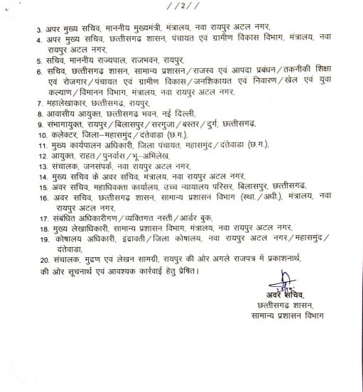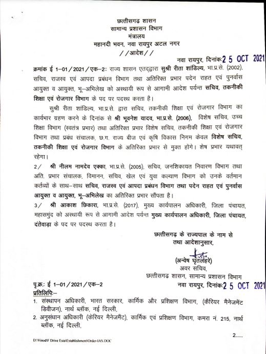 अब सामान्य प्रशासन विभाग ने आदेश जारी कर राजस्व सचिव रीता शांडिल्य को तकनीकी शिक्षा और रोजगार विभाग का सचिव नियुक्त किया है। उनके कार्यभार ग्रहण करने के बाद भुवनेश यादव विशेष सचिव उच्च शिक्षा, प्रबंध संचालक राज्य बीज विकास निगम को तकनीकी शिक्षा एवं रोजगार विभाग के प्रभार से मुक्त होंगे। नीलम नामदेव एक्का सचिव जनशिकायत निवारण विभाग, खेल एवं युवा कल्याण, अतिरिक्त प्रभार संचालक विमानन को राजस्व विभाग का अतिरिक्त प्रभार सौंपा गया है। आकाश छिकारा सीईओ जिला पंचायत महासमुंद को सीईओ जिला पंचायत दंतेवाड़ा के पद पर पदस्थ किया गया है।
