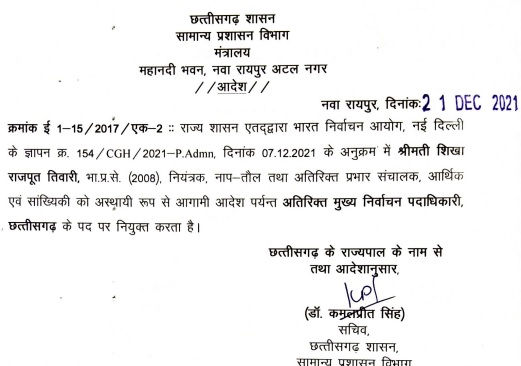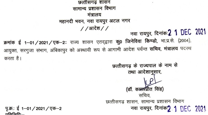 जारी आदेश में अब अतिरिक्त मुख्य निर्वाचन पदाधिकारी की जिम्मेदारी सौंपी गई है। वही 2004 बैच की आईएएस कु. जिनेविवा किण्डो, आयुक्त सरगुजा संभाग को मंत्रालय में बतौर सचिव पदस्थ किया गया है।