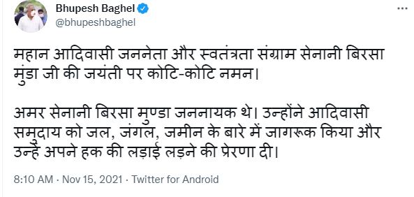 रायपुर। मुख्यमंत्री भूपेश बघेल ने जनजातीय समाज के महान आदिवासी जननेता और स्वतंत्रता संग्राम सेनानी बिरसा मुंडा की जयंती पर उन्हें नमन किया है। उन्होंने अपने संदेश में कहा कि अमर सेनानी बिरसा मुंडा जननायक थे। उन्होंने आदिवासी समुदाय को जल, जंगल, जमीन के बारे में जागरूक किया और अपने हक की लड़ाई लड़ने की प्रेरणा दी। बिरसा मुंडा जी ने तत्कालीन ब्रिटिश साम्राज्य की नीतियों का विरोध किया और आदिवासियों के सामाजिक-आर्थिक उन्नति के लिए जीवन भर काम किया।