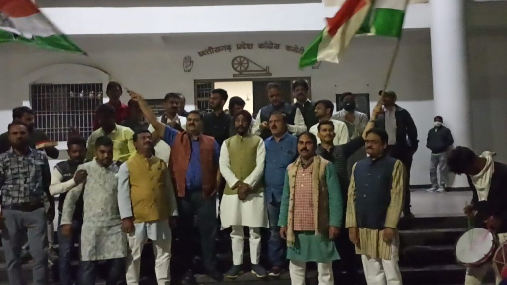 रायपुर। कांग्रेस की भूपेश बघेल सरकार के तीन वर्ष पूरे होने पर कांग्रेस ने प्रदेश भर में उत्सव मनाया। प्रदेश के सभी जिला मुख्यालयों और ब्लाकों में आतिशबाजी कर रैलियां निकालकर प्रभातफेरी निकाल कर मिष्ठान वितरण कर खुशियां मनाई गयी। इस अवसर पर राज्य सरकार के कामों को प्रचारित प्रसारित करने संगोष्ठी भी आयोजन किया गया। सभी जिला कांग्रेस अध्यक्षों और ब्लाक अध्यक्षों को कार्यक्रम संपन्न कराने की जवाबदेही दी गयी थी। प्रदेश कांग्रेस अध्यक्ष मोहन मरकाम खैरागढ़ में चुनाव प्रचार के बाद सरकार के तीन वर्ष के जश्न में शामिल हुये तथा डोंगरगढ़ मां बम्लेश्वरी का दर्शन कर प्रदेश की खुशहाली के लिये आशीर्वाद लिया। प्रदेश कांग्रेस मुख्यालय राजीव भवन में भूपेश बघेल सरकार के 3 वर्ष पूरे होने पर पटाखे फोड़कर और मिठाई खिलाकर जश्न मनाया गया।