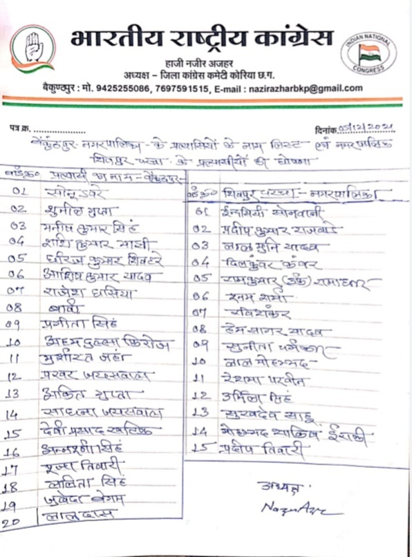 कोरिया। नगरीय निकाय चुनाव को लेकर कांग्रेस ने बैकुंठपुर और शिवपुर चरचा में अपने प्रत्याशियों की घोषणा कर दी है। जिलाध्यक्ष नजीर अजहर ने उम्मीदवारों की सूची जारी कर दी है। इस सूची में बैकुंठपर के लिए 20 और शिवपुर चरचा के लिए 15 सीटों के लिए उम्मीदवारों की सूची जारी कर दी है।
