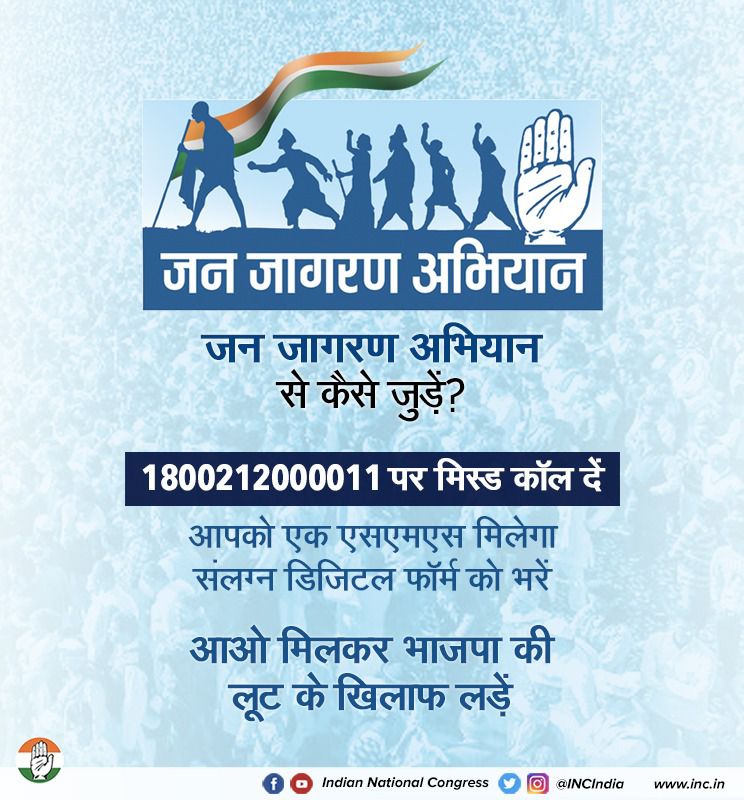 रायपुर/12 नवंबर 2021। अखिल भारतीय कांग्रेस की जन जागरण अभियान की डिजिटल अभियान शुरू हुयी। इस डिजिटल अभियान में 14 नवंबर से 29 नवंबर 2021 के बीच राष्ट्रीय स्तर पर पार्टी के नेता कार्यकर्ता पूरे प्रदेश व देश में पदयात्रा, जनसभा करेंगे। मोदी सरकार में ऐतिहासिक रूप से आवश्यक वस्तुयें की कीमत बढ़ी और मोदी भाजपा सरकार के कुशासन के कारण पीड़ित लोगों की आवाज उठाएंगे। देश का कोई भी व्यक्ति इस नम्बर 1800 212 000 011 पर मिस कॉल कर कांग्रेस के डिजिटल जन जागरण अभियान से जुड़ सकते है। इस नम्बर पर मिस कॉल करने के बाद आपको कुछ जानकरियां देनी होगी। कांग्रेस की सदस्यता भी 5 रू. जमा कर आनलाइन ले सकते हैं। कांग्रेस डिजिटल जन जागरण अभियान मोदी सरकार की महंगाई के ख़लिफ जमी व सोशल मीडिया दोनों पर चलेगा।