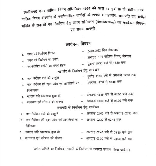 रायपुर। बीरगांव नगर निगम का पहला सम्मेलन 4 जनवरी को बुलाया गया है। इस दौरान निर्वाचित पार्षदों को शपथ दिलाई जाएगी। पहली सामान्य सभा में महापौर, सभापति और अपील समिति के सदस्यों का चुनाव किया जाएगा। रायपुर कलेक्टर इस सम्मेलन में पार्षदों को शपथ दिलाएंगे। जिन पार्षदों द्वारा शपथपत्र पर हस्ताक्षर किया जाएगा, वे ही महापौर और सभापति के चुनाव में भाग ले सकेंगे। जारी कार्यक्रम के अनुसार दोपहर 11.30 बजे महापौर और 2 बजे सभापति का चुनाव किया जाएगा।