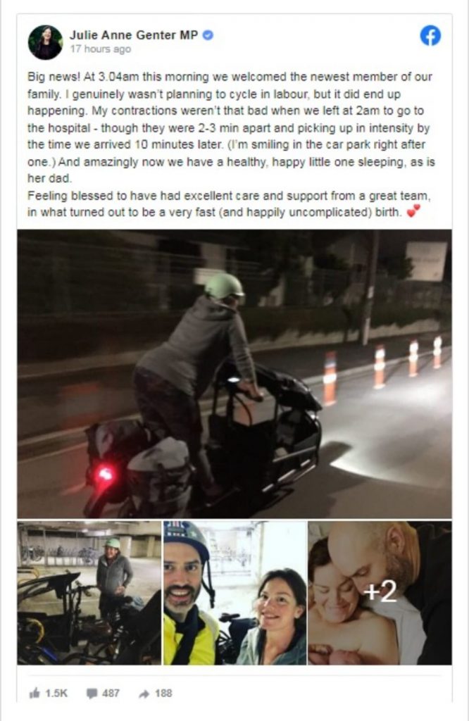 न्यूजीलैंड। न्यूजीलैंड के ग्रीन की महिला सांसद की एक तस्वीर सोशल मीडिया पर जमकर वायरल हो रही है। जूली ने रविवार तड़के प्रसव पीड़ा होने के बाद अपनी साइकिल पर सवार होकर खुद ही अस्पताल पहुंच गईं। यहां उन्होंने एक घंटे बाद एक बच्चे को जन्म दिया। सांसद जूली एनि जेंटर ने अपनी यह तस्वीर अपने सोशल मीडिया हैंडल से शेयर की है। बच्ची को जन्म देने के कुछ घंटों बाद अपने फेसबुक पेज के माध्यम से यह जानकारी दी।