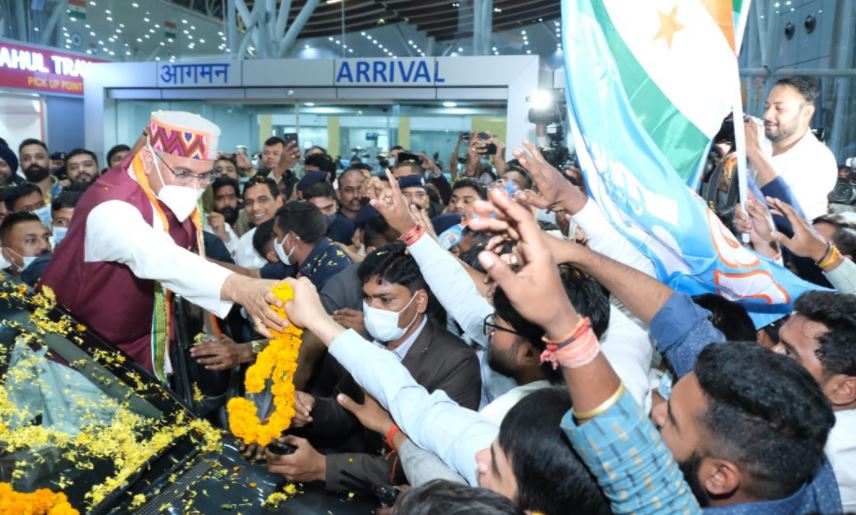रायपुर। स्वच्छतम राज्य का अवार्ड लेने के बाद रायपुर पहुंचे मुख्यमंत्री भूपेश बघेल का एयरपोर्ट पर भव्य स्वागत किया गया। स्वच्छ अमृत महोत्सव में छत्तीसगढ़ को मिले स्वच्छतम राज्य का अवार्ड राष्ट्रपति रामनाथ कोविंद के हाथों ग्रहण कर रायपुर लौटे भूपेश बघेल के अभिनन्दन के लिए एयरपोर्ट पर बड़ी संख्या में कार्यकर्ता उपस्थित थे। लोगों ने पूरी गर्मजोशी के साथ छत्तीसगढ़ को देश के अग्रणी स्वच्छ राज्य का सम्मान मिलने पर ढोल-नगाड़ों के साथ मुख्यमंत्री का स्वागत-अभिनन्दन करते हुए अपनी खुशी व्यक्त की।