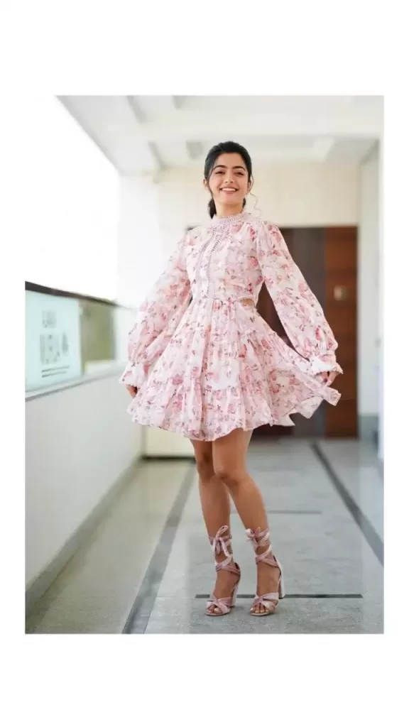 रश्मिका मंदाना को वेस्टर्न वियर में बहुत ही पसंद किया जाता है। आप भी देख सकते है वो शाॅर्ट बेबी पिंक ड्रेस कैरी कर रखी है। इसमें वो बहुत ही प्यारी लग रही हैं। इसके साथ उन्होंने हील्स पहन राखी है और अपने बालों को बंधे हुयी है जो उनके इस लुक को कम्पलीट कर रहा है।