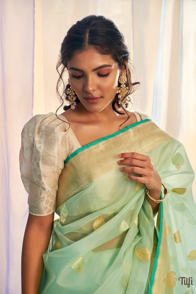इसमें हाफ स्लीव ट्रांसपेरेंट और पफ स्लीव है तो वहीं हाफ स्लीव को टाइट रखा गया है। मतलब यहां एक ही ब्लाउज़ में दो तरह का स्टाइल कैरी किया जा सकता है। जो डेफिनेटली साड़ी के साथ परफेक्ट लगेगा।
