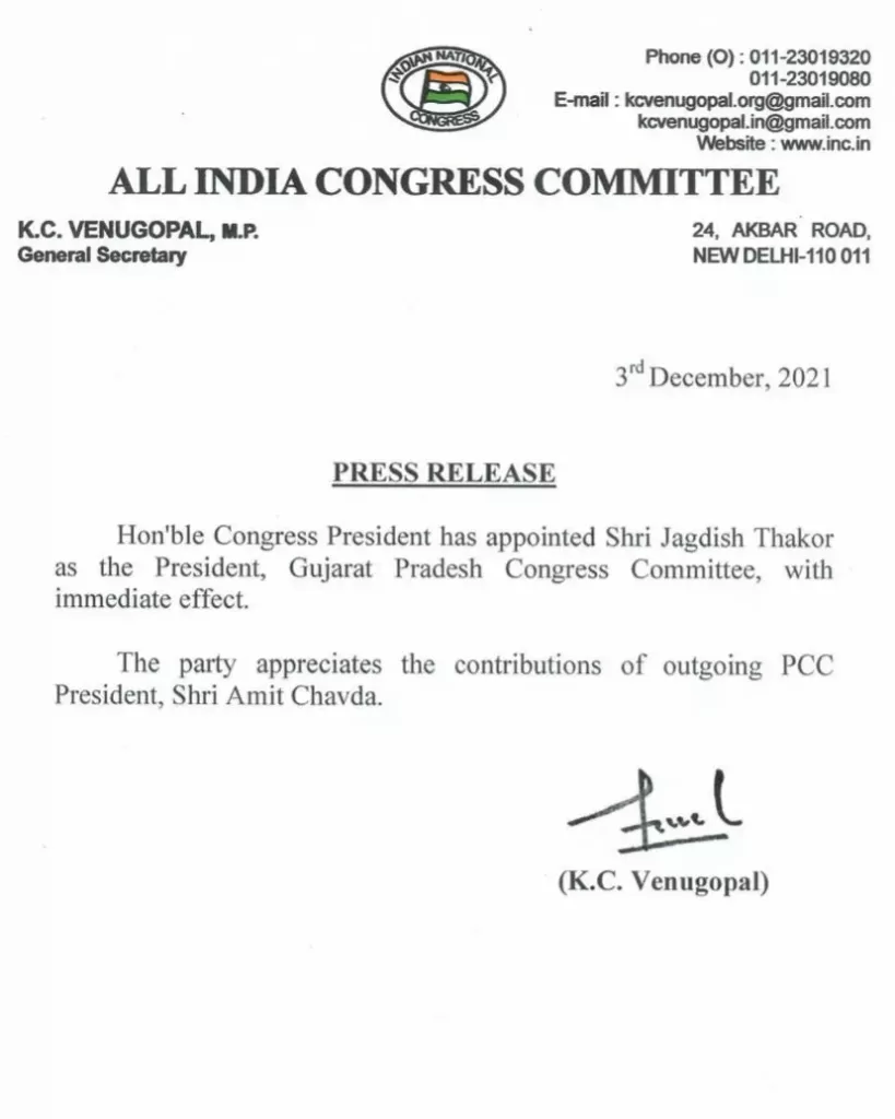 राज्य में फरवरी-मार्च 2021 को हुए पंचायत व पालिका चुनावों में कांग्रेस की करारी हार के बाद प्रदेश कांग्रेस अध्यक्ष अमित चावड़ा व नेता विपक्ष परेश धनाणी ने इस्तीफा दे दिया था। इसके तुरंत बाद ही प्रदेश कांग्रेस प्रभारी राजीव सातव का निधन हो गया था। बीते माह प्रदेश कांग्रेस प्रभारी की नियुक्ति की गई थी। अब इन दो पदों के नाम की घोषणा होगी। माना जा रहा है कि हार्दिक पटेल के अलावा तीन नए कार्यकारी अध्यक्ष बनाए जा सकते हैं। सौराष्ट्र, दक्षिण गुजरात के नेताओं को इसकी जिम्मेदारी सौंपी जाएगी, ताकि पार्टी के पदाधिकारियों में शक्ति संतुलन के साथ जातिगत समीकरण भी साधे जा सकें। इस रेस में पाटीदार समुदाय के नेता हार्दिक पटेल को भी माना जा रहा था, लेकिन लीडरशिप ने जगदीश ठाकोर पर दांव लगाया है।