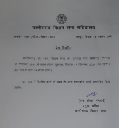 रायपुर। विधानसभा सचिवालय ने शीतकालीन सत्र को लेकर अधिसूचना जारी कर दी गई है। 13 से 17 दिसंबर तक चलने वाले इस सत्र में कुल 5 बैठकें होंगी। अब जल्द ही भाजपा और कांग्रेस दोनों ही दल अपने विधायकों के साथ एक बैठक करेंगे। बैठकों में दोनों ही दल विधानसभा की कार्यवाही को लेकर रणनीति तैयार करेंगे।