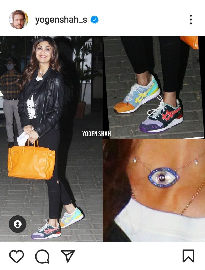 हाल ही में कुछ ऐसा शिल्पा शेट्टी के साथ देखने को मिला बुधवार रात शिल्पा शेट्टी दबंग टूर के लिए रियाद यात्रा पर निकली हैं । कलीना एयरपोर्ट पर शिल्पा शेट्टी को पैपराजी ने कैप्चर किया। इस फ़ोटो ने सबका ध्यान शिल्पा के जूतों की ओर खींच लिया है । शिल्पा नें दोनों पैरों पर अलग अलग तरह के स्नीकर पहन रखा है । शिल्पा नें ब्लैक लैदर जैकेट, व्हाइट टॉप, ब्लैक treggings पहनी थी। एक्ट्रेस अलग अलग कलरफुल स्नीकर और ईविल आई नेकलेस को पहन कर अपने लुक को कम्प्लीट किया ।