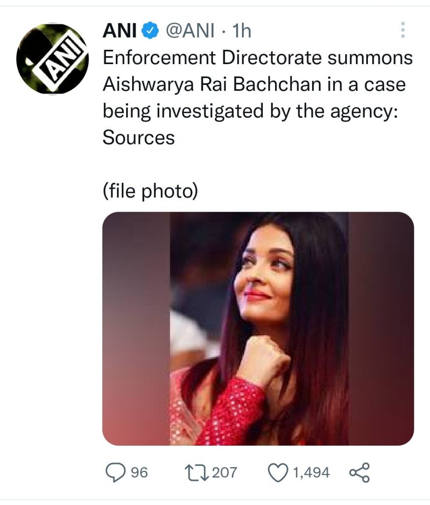 बहुचर्चित पनामा पेपर लीक मामले में प्रवर्तन निदेशालन( ED)ने अभिनेत्री ऐश्वर्या राय बच्चन को समन भेजा है। बच्चन परिवार की बहू और एक्ट्रेस ऐश्वर्या राय आज दिल्ली के लोकनायक भवन में ईडी के सामने पेश होंगी। पनामा पेपर्स मामले की लंबे समय से जांच चल रही है। उनके पति और अभिनेता अभिषेक बच्चन भी एक महीने पहले ईडी दफ्तर पहुंचे थे, जहां उनसे पूछताछ की गई थी। पनामा पेपर लीक में बच्चन परिवार का नाम सामने आया था। बता दें कि ऐश्वर्या राय बच्चन को इससे पहले भी इस मामले में दो बार बुलाया गया था, लेकिन दोनों ही बार उन्होंने नोटिस को स्थगित करने की गुजारिश की थी।
