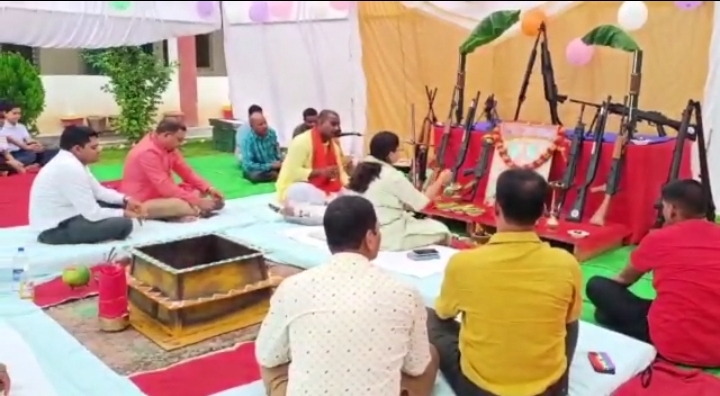 आज विजयदशमी के पावन पर्व के मौके पर जिले के पुलिस लाइन में एसपी पारुल माथुर, अतिरिक्त पुलिस अधीक्षक संतोष महतो, सहित पुलिस विभाग के अधिकारी कर्मचारियों ने अस्त्र सस्त्रों की विधि विधान से पूजा अर्चना की हर साल आज के दिन पुलिस विभाग द्वारा अस्त्र सशत्र की पूजा की जाती है, इस दौरान पुलिस लाइन के सभी अधिकारी कर्मचारी और उनके परिजन उपस्थित रहे।
