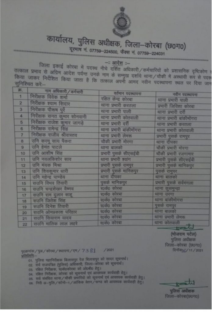 कोरबा। पुलिस अधीक्षक भोज राम पटेल ने जिले में 7 निरीक्षक 7 उप निरीक्षक और 8 सहायक उप निरीक्षक का तबादला किया है। रामेंद्र सिंह को कोतवाली थाना प्रभारी और सनत सोनवानी बने बाकी मोगरा थाना प्रभारी बनाया गया है। इसके अलावा सूची में कई और लोगों को भी शामिल किया गया है।