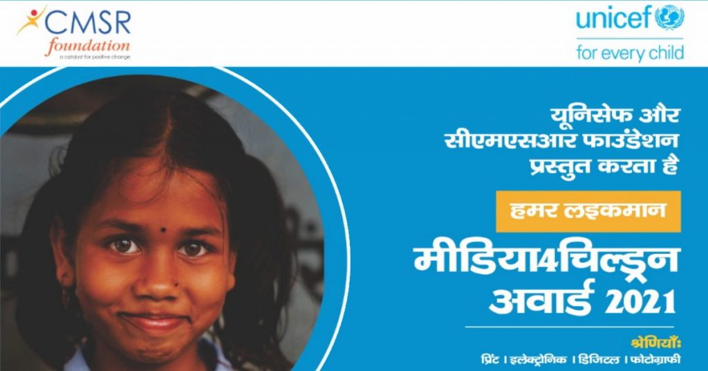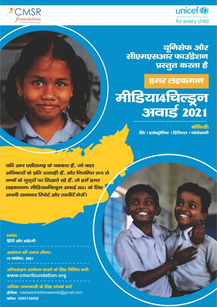 UNICEF ने CMSR फाउंडेशन के साथ मिलकर ‘हमर लइकामन: मीडिया4चिल्ड्रन’ अवॉर्ड की स्थापना की है। जिसके तहत छत्तीसगढ़ में महिलाओं और बच्चों से संबंधित मुद्दों पर असाधारण रिपोर्टिंग के लिए पत्रकारों और फोटो-पत्रकारों को पुरुस्कृत किया जाएगा। यह अवार्ड चार श्रेणियों में दिया जाएगा- प्रिंट, टेलीविजन और रेडियो, डिजिटल समाचार प्लेटफॉर्म और फोटो-पत्रकारिता। इस अवसर पर यूनिसेफ छत्तीसगढ़ के प्रमुख जॉब जकरिया ने कहा है कि मीडिया4चिल्ड्रन अवार्ड बच्चों से जुड़े मुद्दों पर रिपोर्टिंग के लिए दिए जाने वाला छत्तीसगढ़ का पहला मीडिया पुरुस्कार है।